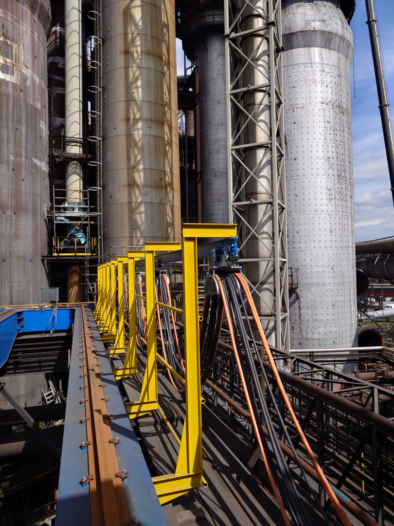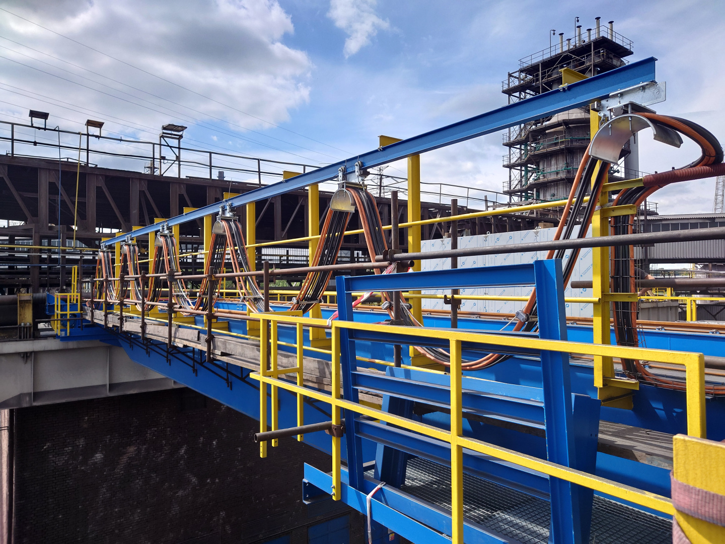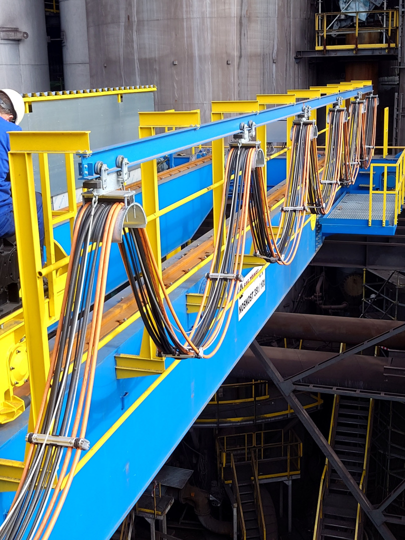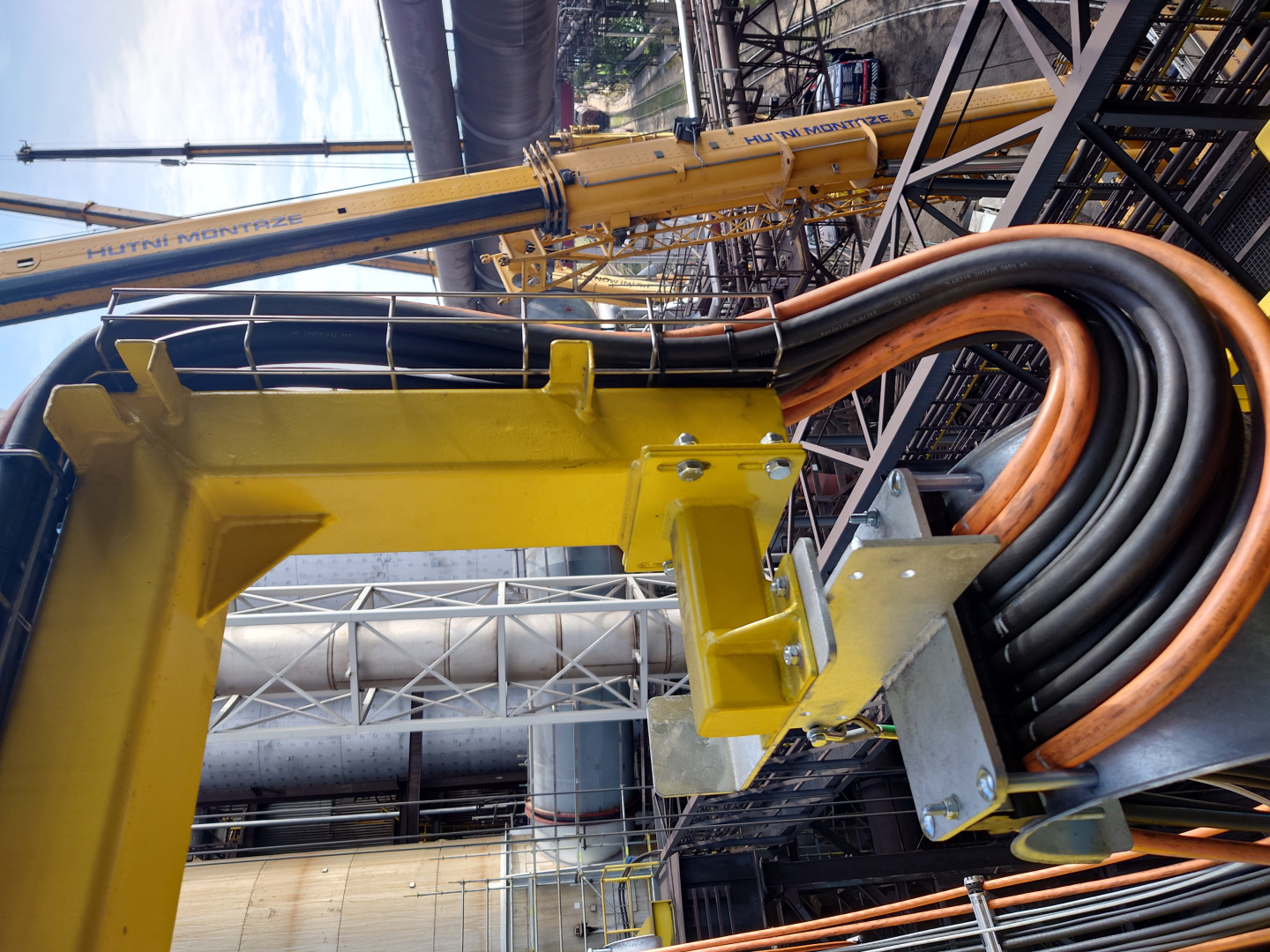 The festoon system P4 ( I-profile IPE100 ) is used to bring power to the crab of the overhead crane. The crane handles metallurgical ladles in ironworks. The length of this festoon system is 15m and contains 23pc of flat PVC cables. The operation of this crane is characterized by a demanding metallurgical environment.