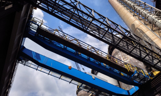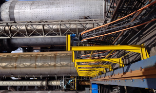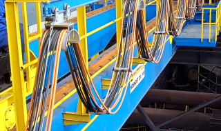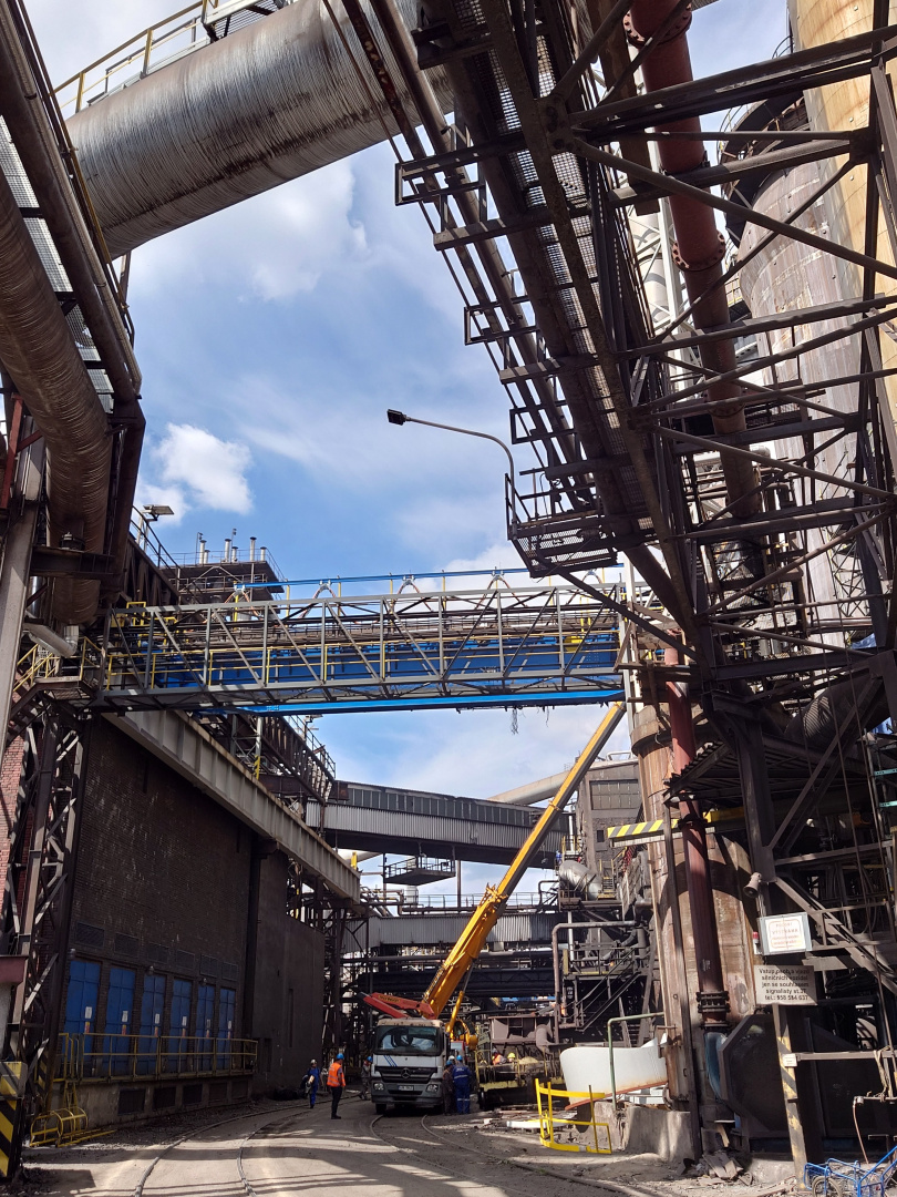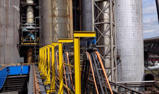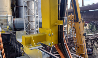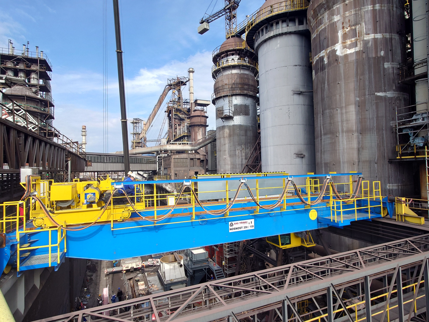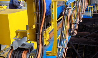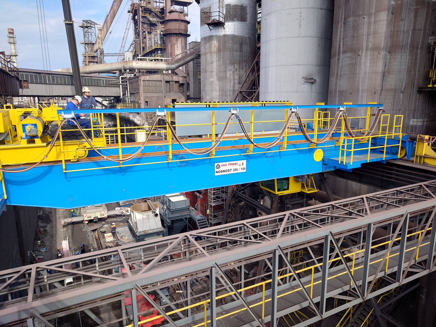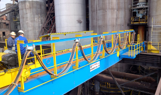 The festoon system P4 ( I-profile IPE100 ) is used to bring power to the crab of the overhead crane. The crane handles metallurgical ladles in ironworks. The length of this festoon system is 15m and contains 23pc of flat PVC cables. The operation of this crane is characterized by a demanding metallurgical environment.