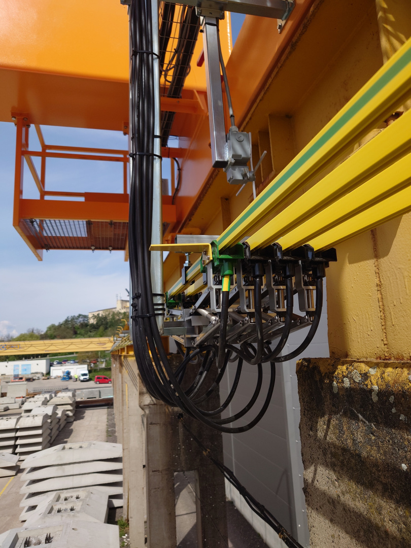 The single pole insulated trolley type 081215 is used to power 3 pc of bridge cranes on an outdoor crane runway 108 m long. This includes 1 pc of crane „Giga“ 10t+10t and 2 pc of cranes „Omis“ each with a lifting capacity of 20t. The cranes are used for handling with concrete parts.