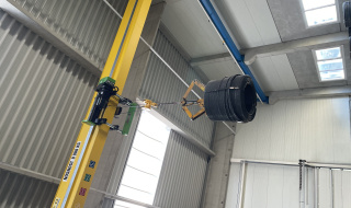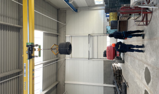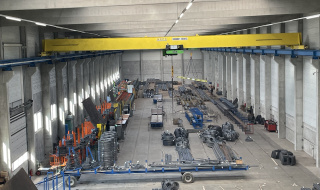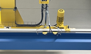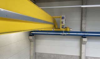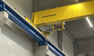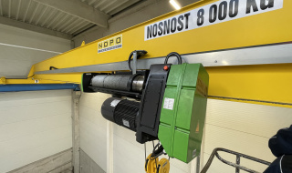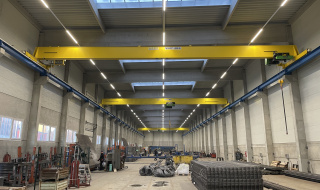 The Stahl wire rope hoists type SH 5020-40 4/1 L3 with a lifting capacity of 8t are used on a bridge cranes „Nopo“ that handles steel semi-finished products in a concrete plant. This is a demanding application with multi-shift operation. The hoist are classified as M5. The lifting speed is 1.6 / 10 m/min, the travel speed is 5 / 20 m/min. The lifting height is 10 m. The cranes are powered by an enclosed conductor bar Fels Elite.