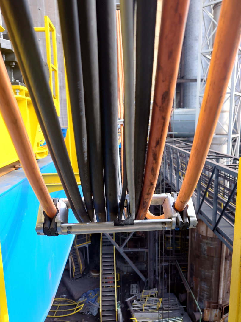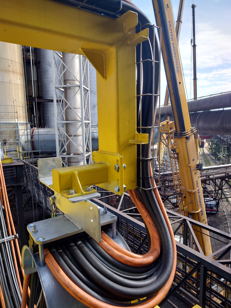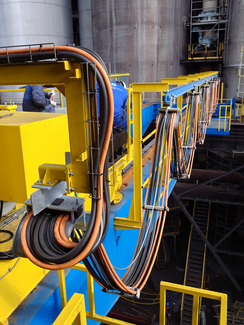 Kabelová vlečka P40 ( pojezd po IPE100 ) slouží pro napájení kočky mostového jeřábu který zajišťuje manipulaci s pánvemi v železárnách. Délka kabelové vlečky je 15m a obsahuje 23ks plochých PVC kabelů. Provoz tohoto jeřábu se vyznačuje náročným hutním prostředím.