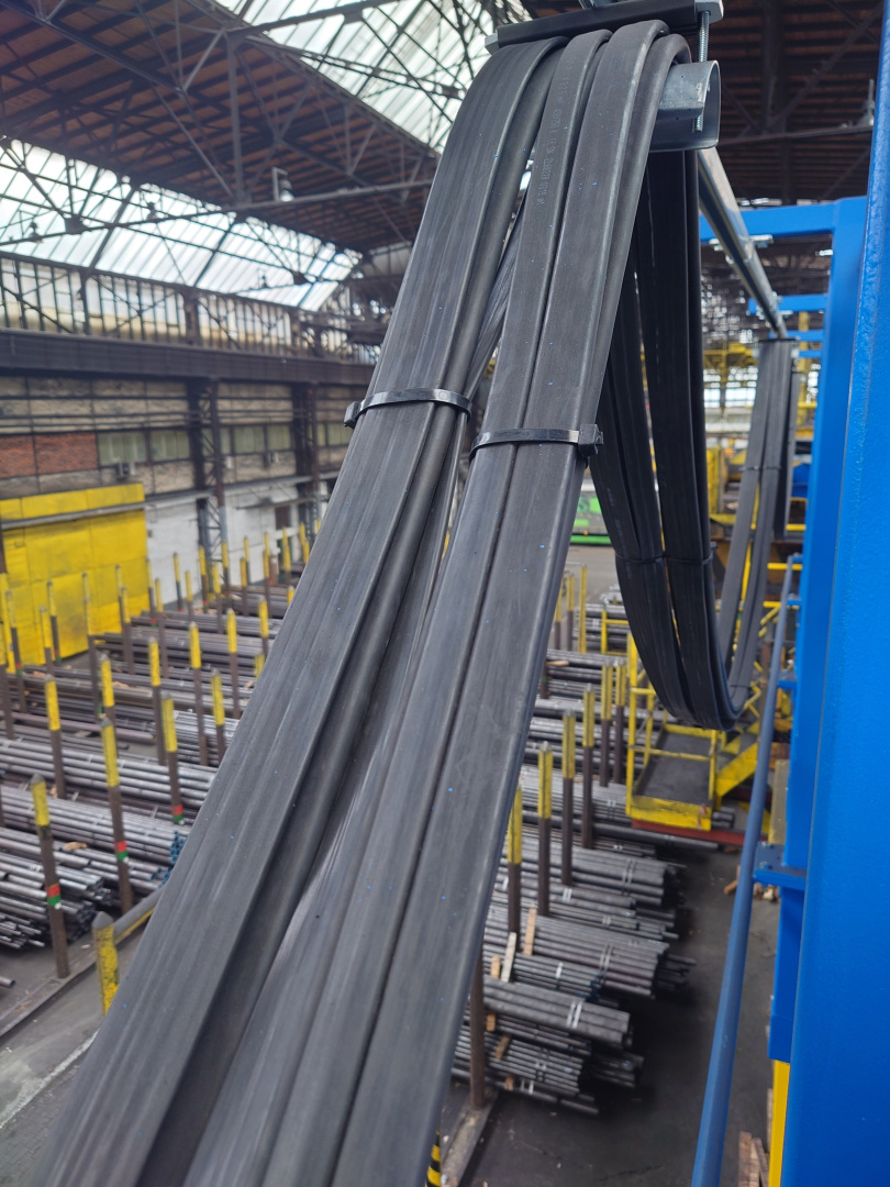 Kabelová vlečka C2 ( C-profil 40x40 mm ) slouží pro napájení kočky mostového jeřábu který zajišťuje manipulaci s hutními polotovary v železárnách. Délka kabelové vlečky je 21,5m a obsahuje 8ks plochých PVC kabelů.