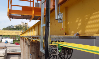 The single pole insulated trolley type 081215 is used to power 3 pc of bridge cranes on an outdoor crane runway 108 m long. This includes 1 pc of crane „Giga“ 10t+10t and 2 pc of cranes „Omis“ each with a lifting capacity of 20t. The cranes are used for handling with concrete parts.