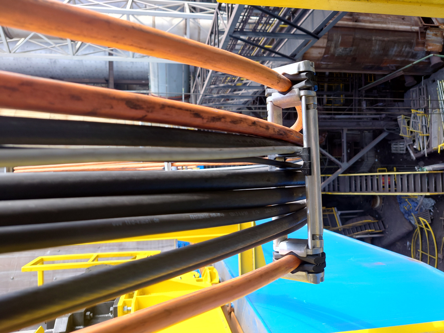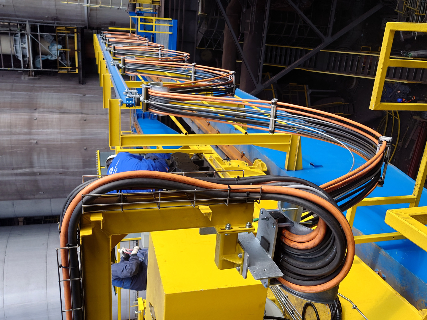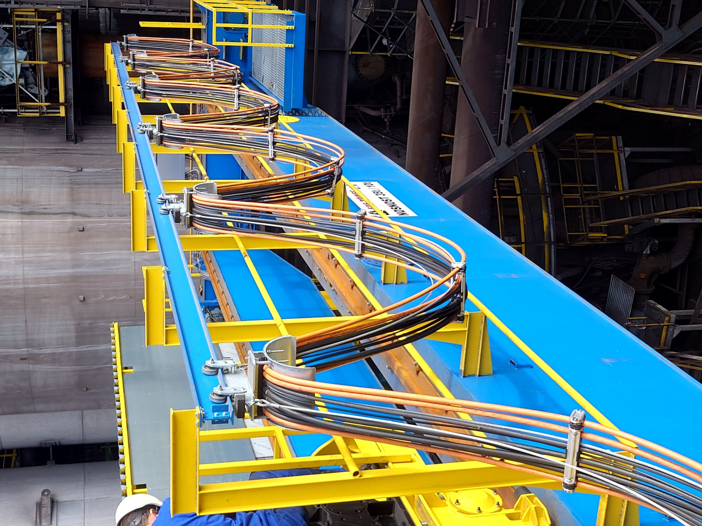 Kabelová vlečka P40 ( pojezd po IPE100 ) slouží pro napájení kočky mostového jeřábu který zajišťuje manipulaci s pánvemi v železárnách. Délka kabelové vlečky je 15m a obsahuje 23ks plochých PVC kabelů. Provoz tohoto jeřábu se vyznačuje náročným hutním prostředím.